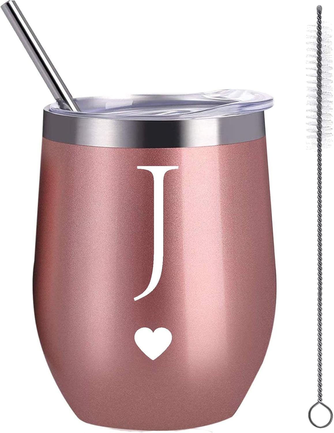 Personalized Initial Gifts 12 Ounces Stainless Steel Wine Tumbler with Straw Brush Rose Gold Insulted Mug Wedding Bridesmaid Birthday Graduation Gift for Men Women Monogrammed Gift (J)