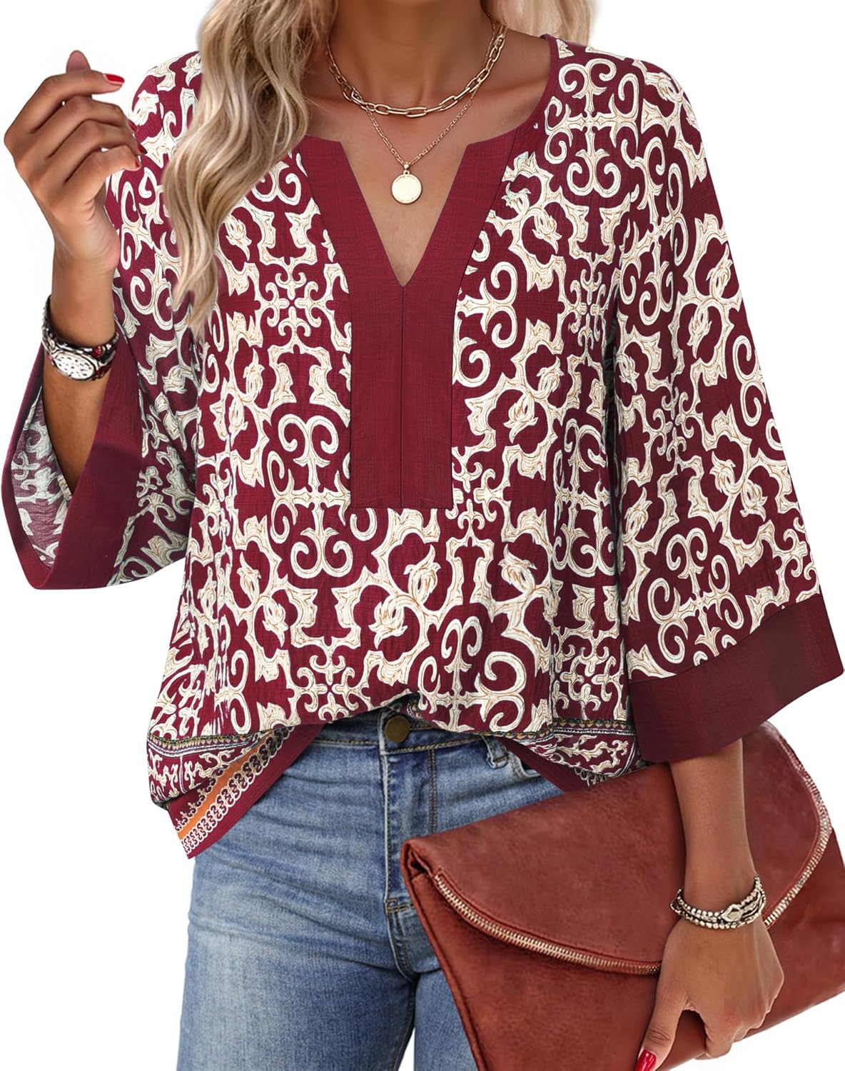 Bebonnie Women Blouses Dressy Casual 3/4 Sleeve V Neck Floral Loose Fit Tunic Tops