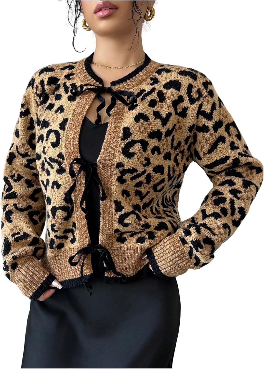 Verdusa Women's Y2K Leopard Print Cardigan Sweaters Streetwear Tie Knot Knit Outerwear