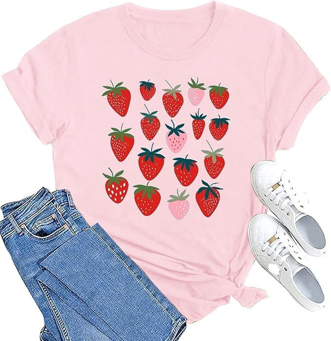 Cute Red Pink Strawberry Print Fruit Graphic T Shirts for Women Party