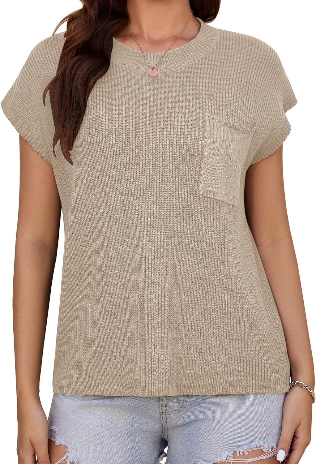 Women's Summer Short Sleeve Sweater with Chest Pocket Ribbed Crew Neck Loose Pullover Top