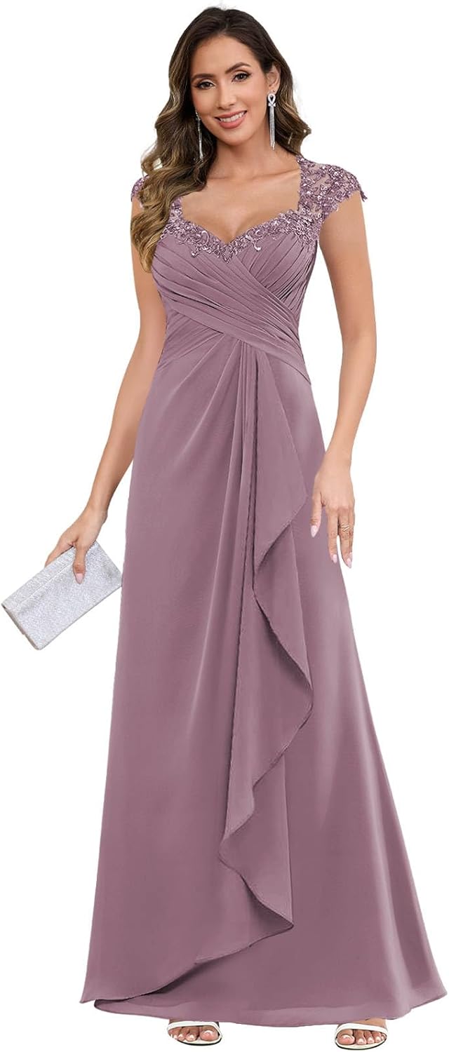 Cap Sleeve Mother of The Bride Dresses V Neck Chiffon Lace Formal Gown Long Ruffle Bridesmaid Dress