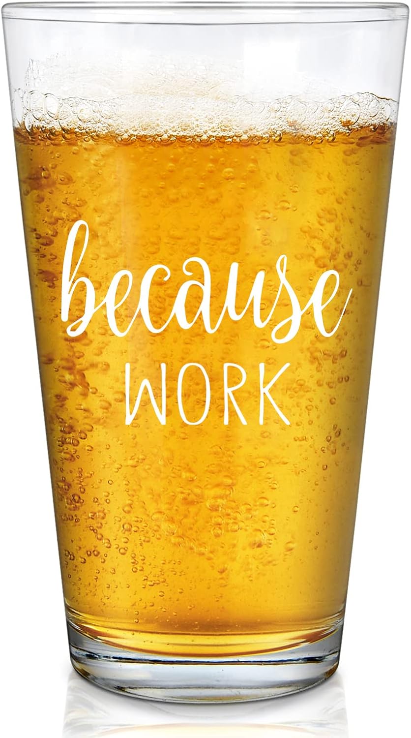 - UNIQUE DESIGN: The beer pint glass is an ideal Boss Day gift, Christmas gifts. We believe simple designs can convey more, just like our beer pint glass with funny words Because Work, which is a simple but unique gift idea for your coworker or boss.
